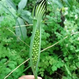 花序柄近圆柱形,常5-8枚并列于同一叶柄鞘内,先后抽出,长30-80厘米,粗1-2厘米,每一花序柄围以1枚鳞叶;鳞叶膜质,披针形,渐尖,长与花序柄近相等,展平宽3厘米,背部有2条棱凸。佛焰苞长12-24厘米:管部绿色,椭圆状,长3-6厘米,粗1.5-2厘米,席卷;檐部长8-19厘米,粉白色,长圆形或椭圆状长圆形,基部兜状,舟形展开,直径2-3厘米,锐尖,直立。肉穗花序长9-20厘米,雌花序圆锥状,奶黄色,基部斜截形;不育雄花序长圆锥状,长3-4.5厘米,下部粗1-2厘米;能育雄花序长5-14厘米,雄花棱柱状,长4毫米,雄蕊4,药室长圆柱形。附属器极短小,锥状,长1-5毫米。浆果圆柱形,长5毫米,种子多数,纺锤形,有多条明显的纵棱。花期4-6月,果9月成熟。
