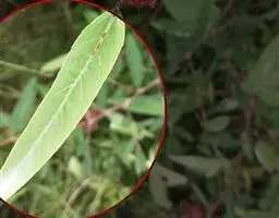 叶交互对生,于茎下部密集,于茎上部稀疏,线状披针形,长6-10厘米,宽4-7毫米,先端渐尖或尖,基部半抱茎,全缘;侧脉不明显;无叶柄;总苞叶和茎叶均为2枚,卵状长三角形,长3-8厘米,宽2-4厘米,先端渐尖或急尖,基部近平截或半抱茎,全缘,无柄。