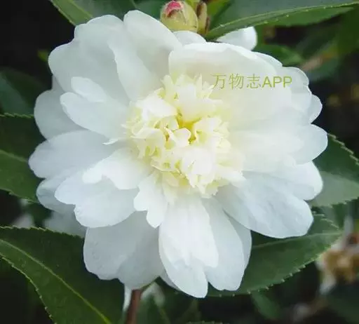 山茶是灌木或小乔木植物,高9米,嫩枝无毛。叶革质,椭圆形,长5-10厘米,宽2.5-5厘米,先端略尖,或急短尖而有钝尖头,基部阔楔形,上面深绿色,干后发亮,无毛,下面浅绿色,无毛,侧脉7-8对,在上下两面均能见,边缘有相隔2-3.5厘米的细锯齿。叶柄长8-15毫米,无毛。