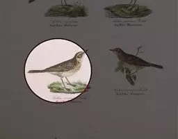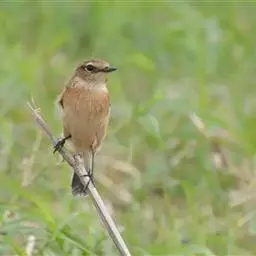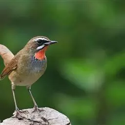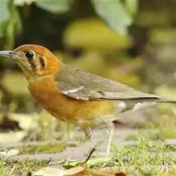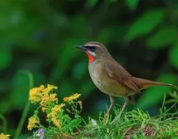 日本歌鸲:体型小似麻雀,但羽毛颜色较为美丽。嘴细长,嘴须不发达;翅短圆,上体草黄褐;雄鸟喉部橙棕色,…