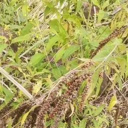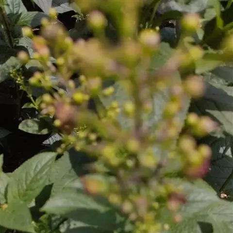 穗状花序,长达50厘米,宽不超过2厘米,除顶生花序外,常由上部叶腋发出侧生花序,聚伞花序全部互生或下部的极接近而似对生,总花梗和花梗均不超过5毫米,多少有腺毛;花萼长约2毫米,裂片卵状椭圆形至宽卵形,顶端钝至圆形;花冠黄绿色,长5-6毫米,上唇长于下唇约1.5毫米,两唇的裂片均圆钝,上唇2裂片边缘互相重叠,下唇中裂片略小;雄蕊几与下唇等长,退化雄蕊倒卵状圆形;花柱长约3毫米,长约为子房的2倍。蒴果卵圆形,长4-6毫米。