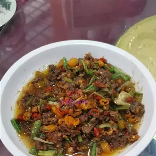 小炒黄牛肉 主料:黄牛肉(牛里脊肉)200克、青尖椒100克、红尖椒100克。