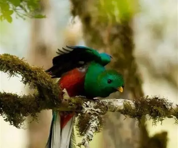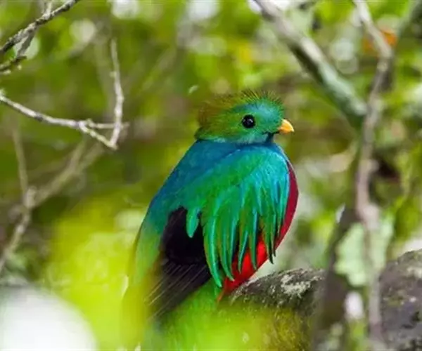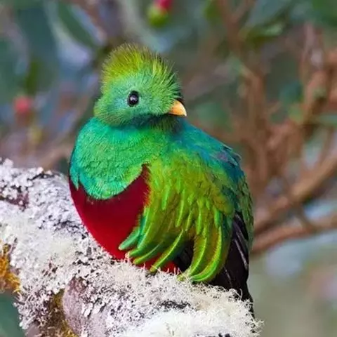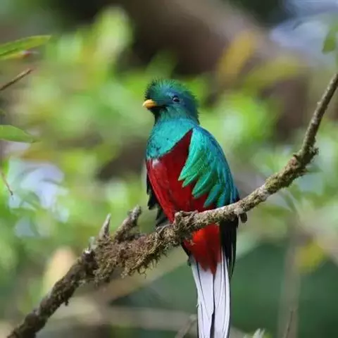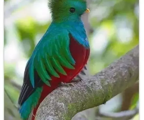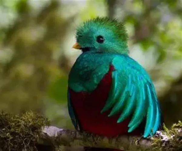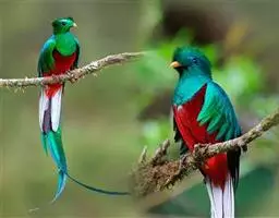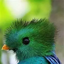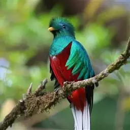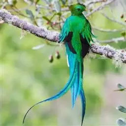 绿咬鹃(分布从墨西哥南部至玻利维亚)是古代马雅人和阿兹特克人的圣鸟;其形象见于危地马拉的国徽;该国货币名格查尔(quetzal),意即绿咬鹃。该物种尾羽长而呈蓝绿色(飞行时尾的下部呈白色)。头具圆形发状羽冠,胸金绿色,背蓝色,翕羽卷曲而带金黄色泽,腹部红色。
