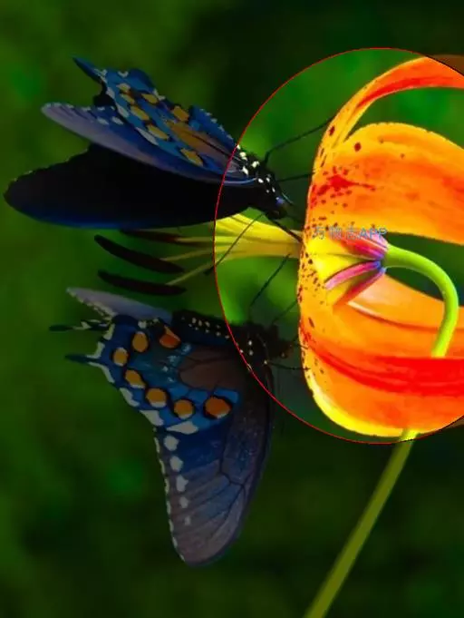 花3-6朵或更多;苞片叶状,卵状披针形,长1.5-2厘米,宽2-5毫米,先端钝,有白绵毛;花梗长6.5-9厘米,紫色,有白色绵毛;花下垂,花被片披针形,反卷,橙红色,有紫黑色斑点;外轮花被片长6-10厘米,宽1-2厘米;内轮花被片稍宽,蜜腺两边有乳头状突起,尚有流苏状突起;雄蕊四面张开;花丝长5-7厘米,淡红色,无毛,花药矩圆形,长约2厘米;子房圆柱形,长1.5-2厘米,宽2-3毫米;花柱长4.5-6.5厘米,柱头稍膨大,3裂。