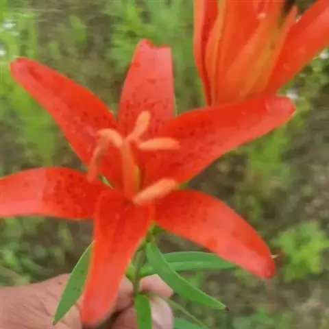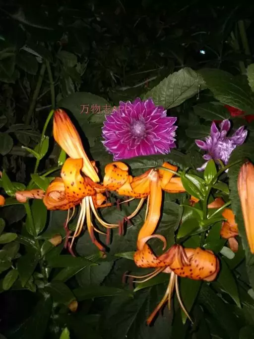 卷丹(学名:Lilium lancifolium Thunb.):卷丹花瓣有平展的,有向外翻卷的,故有“卷丹”美名。鳞茎近宽球形,高约3.5厘米,直径4-8厘米;鳞片宽卵形,长2.5-3厘米,宽1.4-2.5厘米,白色。茎高0.8-1.5米,带紫色条纹,具白色绵毛。叶散生,矩圆状披针形或披针形,两面近无毛,有5-7条脉。花3-6朵或更多;苞片叶状,卵状披针形;花下垂,花被片披针形,反卷,橙红色,有紫黑色斑点。蒴果狭长卵形,长3-4厘米。花期7-8月,果期9-10月。