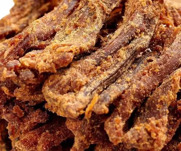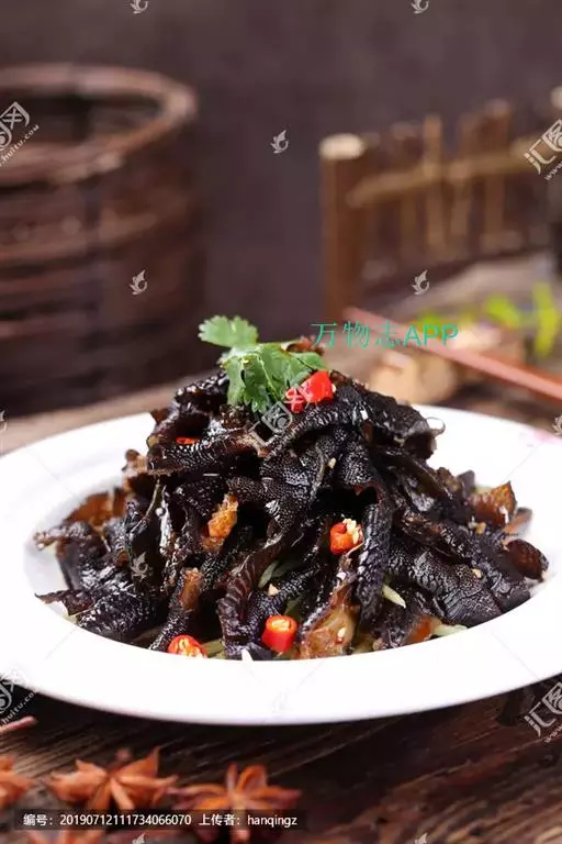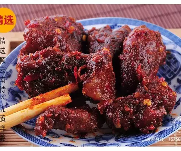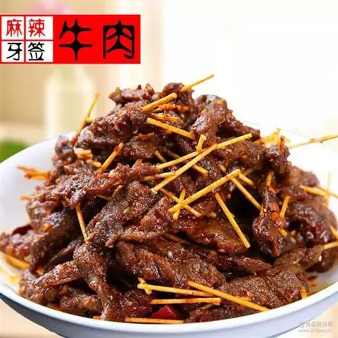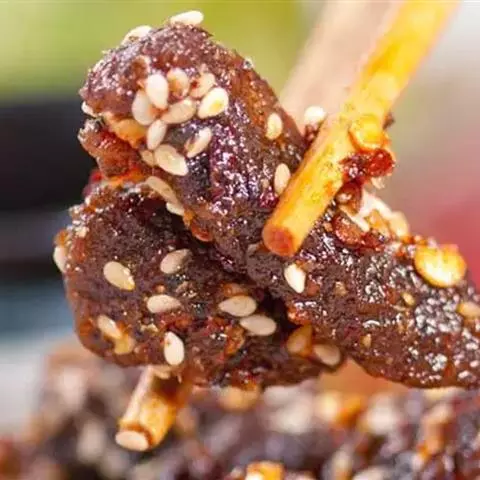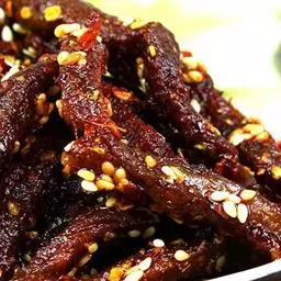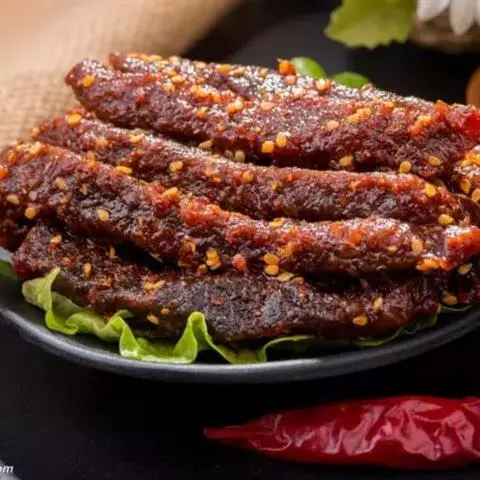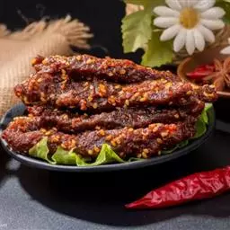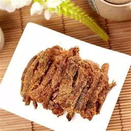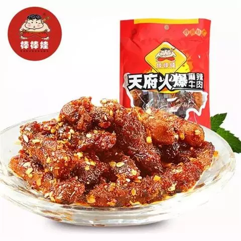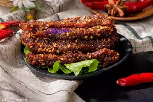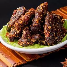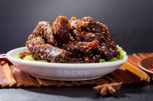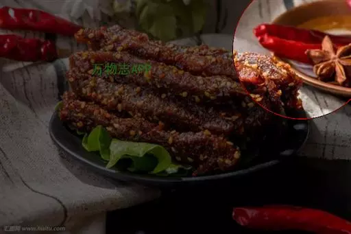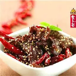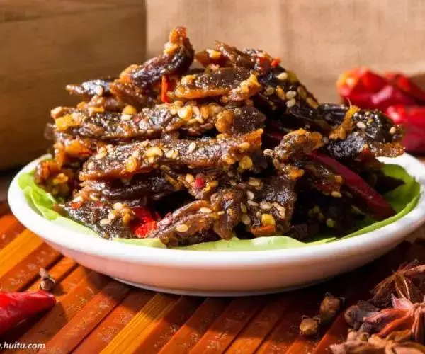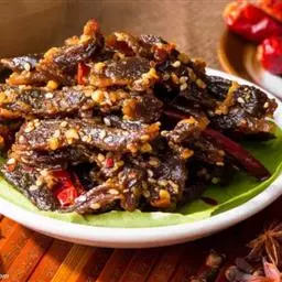 色泽红亮,质地干香酥脆,麻辣味厚,为喝酒佳品。