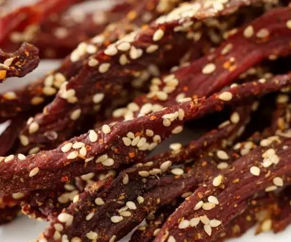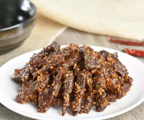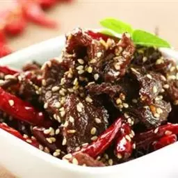 3.锅中加油,下花椒、干辣椒、葱姜煸出香味,放入牛肉条爆炒,加盐、白糖、辣椒油爆炒。加入芝麻,翻炒均匀后即可出锅。