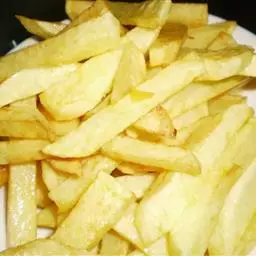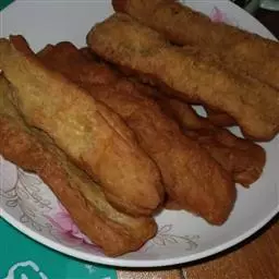 2.将牛肉切成条,沾淀粉下锅炸,捞出控油