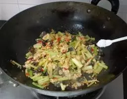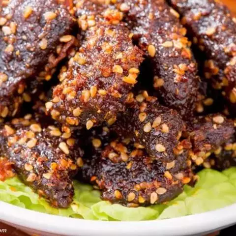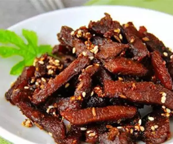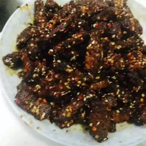 10. 然后中火收汁,汁干时加入辣椒油,撒上炒熟的芝麻翻炒均匀出锅,凉后装盘食用。