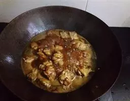 9. 锅内留30克油,下入花椒、干辣椒、葱姜煸出香味加入汤,放入炸好的牛肉条、精盐、白糖、料酒烧制;