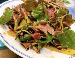 1. 瘦牛肉洗净去筋,放入排松的葱姜、盐、木瓜汁、料酒腌制30~60分钟,然后煮熟肉(也可蒸熟),取出晾凉