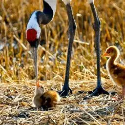 巢的大小距水位50-86厘米,直径12.5厘米以上。每窝产2-4枚卵,通常产1- 2卵。卵浅蓝色,孵化期28-30天。孵化后约12小时,雏鸟就能游泳和漂浮在水面 上。24小时后开始自己吃东西。通过孵化的第二天,幼鸟就能够与父母徜徉并寻找食物,晚上不愿意回巢。雏鸡孵化后整个家庭不在于稀树草原觅食,而是保持在沼泽地区,那里的草丛能提供最大的食物覆盖范围。孵化56-100天后小鸟长出羽毛。亚成鸟将加入种群一起活动,3岁左右达到生殖成熟。