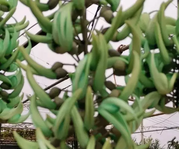 原产菲律宾的热带雨林,爪形花朵颜色从蓝绿色到薄荷绿各不相同,花序可达1.5米。极不寻常的色彩几乎不同于任何植物,一些著名园林如英国皇家植物园、剑桥大学植物园都有引入。