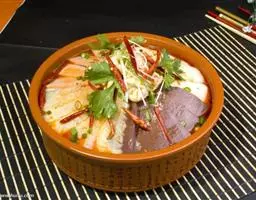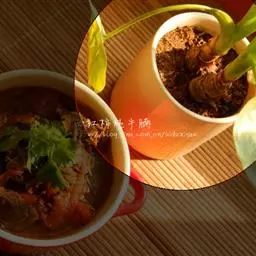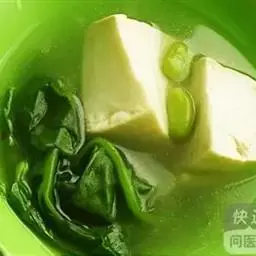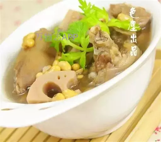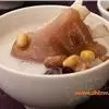 ②加绍酒、葱及用清水浸泡过1小时的黄豆,中火35分钟,加盐、味精调味,再高火15分钟即可。