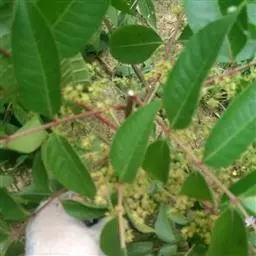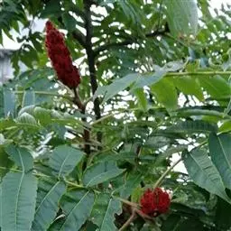 木蜡树 落叶乔木或小乔木,高达10米;幼枝和芽 被黄褐色绒毛,树皮灰褐色。奇数羽状复叶互生,有小叶3-6对,稀7对,叶轴和叶柄圆柱形,密被黄褐色绒毛;叶柄长4-8厘米;小叶对生,纸质,卵形或卵状椭圆形或长圆形,长4-10厘米,宽2-4厘米,先端渐尖或急尖,基部不对称,圆形或阔楔形,全缘,叶面中脉密被卷曲微柔毛,其余被平伏微柔毛,叶背密被柔毛或仅脉上较密,侧脉15-25对,两面突起,细脉在叶背略突;小叶无柄或具短柄。圆锥花序长8-15厘米,密被锈色绒毛,总梗长1.5-3厘米;花黄色,花梗长1.5毫米,被卷曲微柔毛;花萼无毛,裂片卵形,长约0.8毫米,先端钝;花瓣长圆形,长约1.6毫米,具暗褐色脉纹,无毛;雄蕊伸出,花丝线形,长约1.5毫米,花药卵形,长约0.5毫米,无毛,在雌花中雄蕊较短,花丝钻形;花盘无毛;子房球形,径约1毫米,无毛。核果极偏斜,压扁,先端偏于一侧,长约8毫米,宽6-7毫米,外果皮薄,具光泽,无毛,成熟时不裂,中果皮蜡质,果核坚硬。