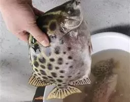 形态特征:体侧扁,呈长椭圆形,一般体长15~30厘米、体重300~1000克、自头部至背鳍前隆起。体被大弱栉鳞,头部和胸鳍前鳞细小而紧密,腹面和背部鳞较大。头大,口小、左右额骨愈合成一块,上颌前端有犬牙4个,两侧有臼齿2列。前部为颗粒状,后渐增大为臼齿;下颌前端有犬牙6个,两侧有颗粒状臼齿2列、前鳃盖骨后半部具鳞、全身呈现淡红色,体侧背部散布着鲜艳的蓝色斑点。尾鳍后缘为墨绿色,背鳍基部有白色斑点。