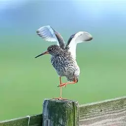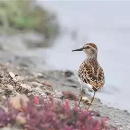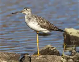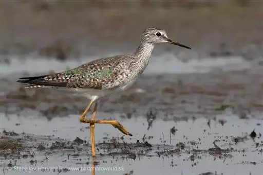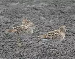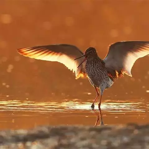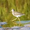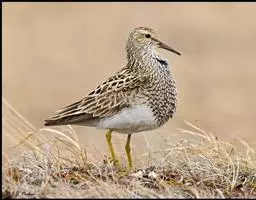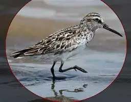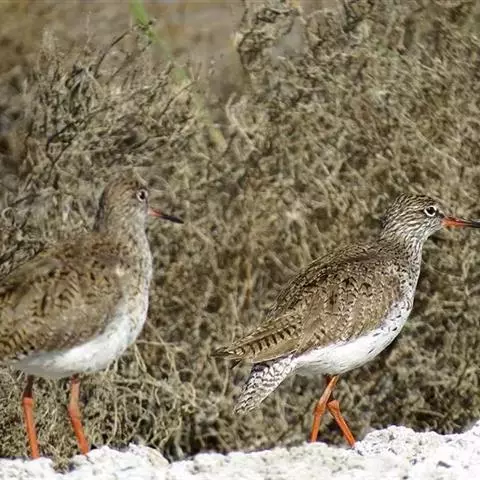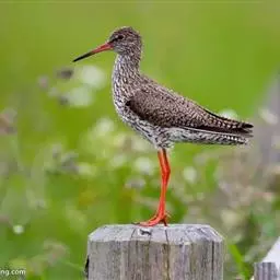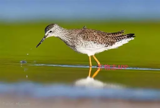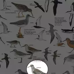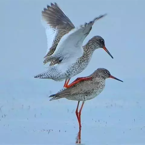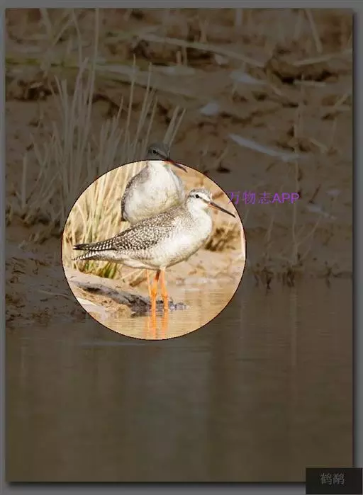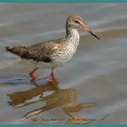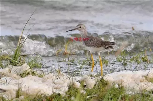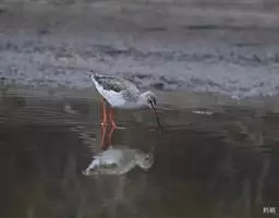 红脚鹬:体长28厘米,上体褐灰,下体白色,胸具褐色纵纹。飞行时腰部白色明显,次级飞羽具明显白色外缘。…