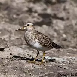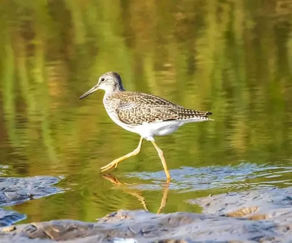 小黄脚鹬(学名:Tringa flavipes):小型涉禽,体长23-25厘米。嘴较细直、黑褐色。脚较长、橙黄色。夏羽头、颈、胸具褐色纵纹,眼周有显著的白色圈,在暗色的头上甚为醒目。肩、背、三级飞羽黑色具白色斑点。腰和尾上覆羽白色,下体亦主要为白色。冬羽上体灰褐色具不清晰的白色斑点,胸灰褐色微具淡色纵纹。