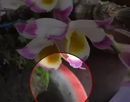 总状花序腋生,通常具1-3朵花;花序柄长4-6厘米,被2-3枚筒状鞘;花苞片卵形,通常6-7毫米,宽约4毫米,先端稍钝;花梗和子房长约2.5厘米;花开展;萼片和花瓣白色带粉红色,在背面中肋被少数褐红色斑点,多少扭转或边缘波状,中裂片倒卵状长圆形,通常长1.3-1.6厘米,宽4-5.8毫米,先端钝,基部收狭,具3条脉,其外侧的脉几乎不分枝,在背面中肋隆起呈龙骨状;侧萼片斜长圆形或镰刀状长圆形,通常长1.6-1.7厘米,宽5.5-8.3厘米,先端稍锐尖,基部收狭,具4条脉,其外侧的脉稍分枝,在背面中肋隆起呈龙骨状。