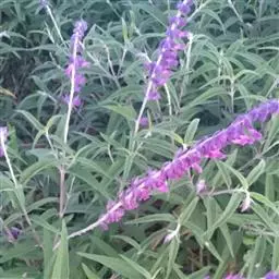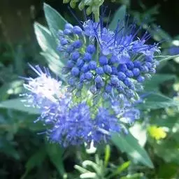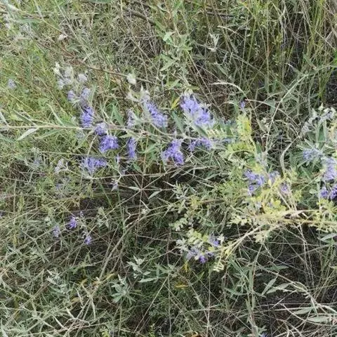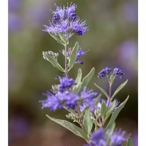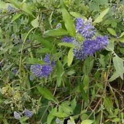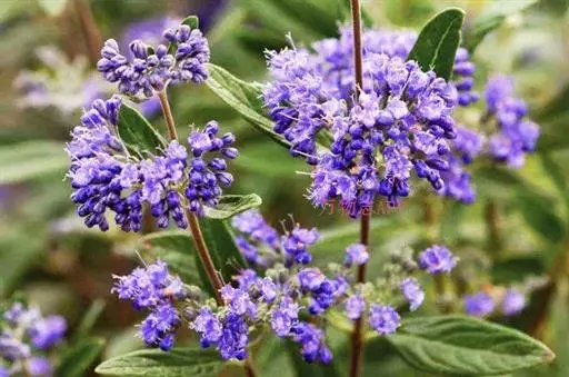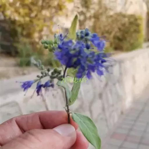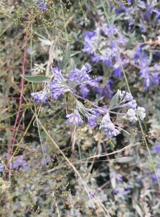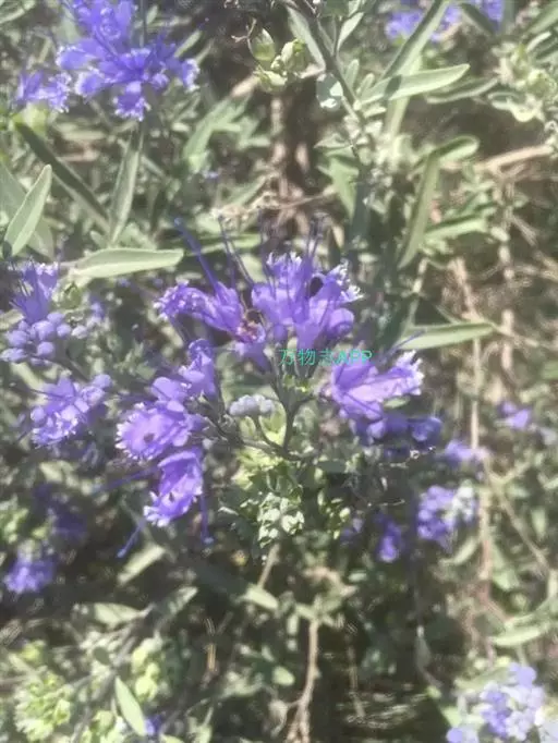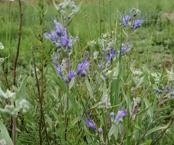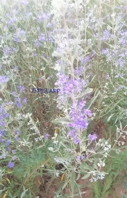 蒙古莸(学名:Caryopteris mongholica Bunge):为马鞭草科莸属落叶小灌木。常自基部即分枝,嫩枝紫褐色,圆柱形,有毛,老枝毛渐脱落。叶片厚纸质,线状披针形或线状长圆形,背面密生灰白色绒毛。聚伞花序腋生,无苞片和小苞片,花萼钟状,花冠蓝紫色。蒴果椭圆状球形,无毛,果瓣具翅。花果期8-10月。