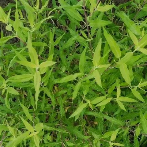 落叶小灌木,常自基部即分枝,高0.3-0-1.5米;嫩枝紫褐色,圆柱形 ,有毛,老枝毛渐脱落。叶片厚纸质,线状披针形或线状长圆形,全缘,很少有稀齿,长0.8-4厘米,宽2-7毫米,表面深绿色,稍被细毛,背面密生灰白色绒毛;叶柄长约3毫米。