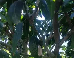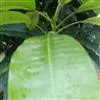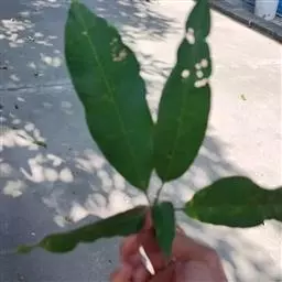 芒果 常绿大乔木,高10-20米;树皮灰褐色,小枝褐色,无毛。叶薄革质,常集生枝顶,叶形和大小变化较大,通常为长圆形或长圆状披针形,长12-30厘米,宽3.5-6.5厘米,先端渐尖、长渐尖或急尖,基部楔形或近圆形,边缘皱波状,无毛,叶面略具光泽,侧脉20-25对,斜升,两面突起,网脉不显,叶柄长2-6厘米,上面具槽,基部膨大。