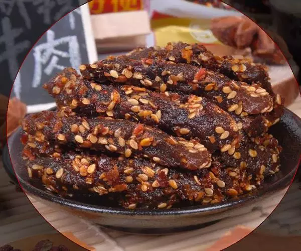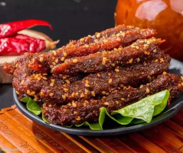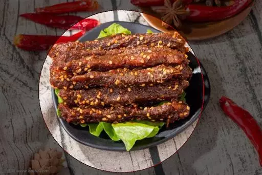 4.锅底留油25克,烧糊花椒捞出不要,再炸干辣椒成紫黑色,加葱、姜炒一下,注入汤150毫升,加酱油、糖及余下料酒,放入牛肉上火收汁,汁快尽时加入味精,汁干时加入辣椒油,撒上芝麻,翻匀即成,食时挑去辣椒装盘。