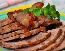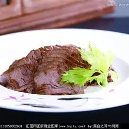 1.将牛后腿肉洗净,切成两块,放在冷水里浸泡1小时后捞起,放在汤锅中,加清汤、葱段、姜块、花椒、黄酒,上火烧沸,撇去浮沫,转小火上煮3小时,待牛肉九成烂时,捞出控去汤,晾凉。