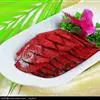 3.将香油注入锅中,上火烧至七成热,下入干辣椒炸焦,再放入葱段、姜段桂皮、花椒略炸一下,随即注入清汤,加入料酒、精盐、白糖、酱油,再倒入炸好的牛肉片,在微火上将汁靠浓。待汁快靠完时,倒入盆中晾凉,将牛肉挑出码在圆盘内,上面码上用燕窝做成的“吉”字即成。