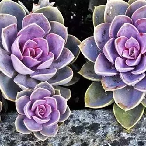 紫珍珠是景天科石莲花属的多年生肉质草本植物。植株中小型;叶片肉质,匙形,呈莲座状紧密排列;叶片粉紫色,…