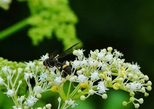 复伞形花序顶生,大而疏散,总花梗基部托以叶状总苞片,分枝3-5出,纤细,被黄色疏柔毛;杯形不孕性花不脱落,可孕性花小;萼筒杯状,萼齿三角形;花冠白色,仅基部联合,花药黄色或紫色;子房3室,花柱极短或几无,柱头3裂。