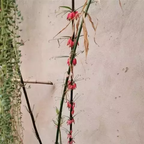 花序具2花,总花梗长1-2厘米,顶端具2枚叶状苞片;苞片卵形至宽卵形,长2-3.5厘米,宽1-3厘米,宿存,具多脉;花梗极短,仅长1-2毫米,花被绿白色至淡黄绿色,全长约2.3-2.5厘米,裂片长约3毫米;花丝长2-3毫米,向上略弯,两侧扁,具乳头状突起,花药长4-5毫米;子房长约5毫米,花柱长18-20毫米,等长于或稍伸出花被之外。
