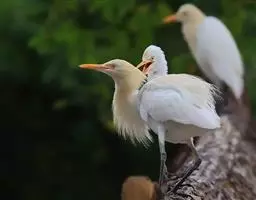 雪鹭:全身洁白的羽毛,颈背有丝状蓑羽。有一双亭亭玉立黄色长腿和一个黑色的鸟喙。在繁殖季节,鼻孔和眼…