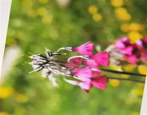 花葶高10-60(90)厘米,顶端被白色粉 (干后常呈乳黄色);伞形花序5-10花,有时出现第2轮花序;苞片披针形,长5-10毫米;花梗长1-5厘米,多少被粉,开花时下弯,果时直立;花萼窄钟状,长10毫米,上半部分裂成披针形或三角状披针形裂片,沿裂片背面下延至基部一线无粉,染紫色,沿每2裂片的边缘下延至基部密被白粉,因而整个花萼形成紫白相间的10条纵带;花冠红紫色至深玫瑰红色,长1.5-2.5厘米,喉部无环状附属物,冠檐直径1.5-2.5厘米,裂片倒卵状矩圆形;先端圆形或微具凹缺;长花柱花:冠筒长9-10毫米,雄蕊着生处略低于冠筒中部,花在与自冠尚等长或微露出筒口;短花柱花;雄蕊近冠筒口着生,花柱长2-3毫米。