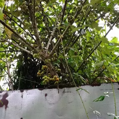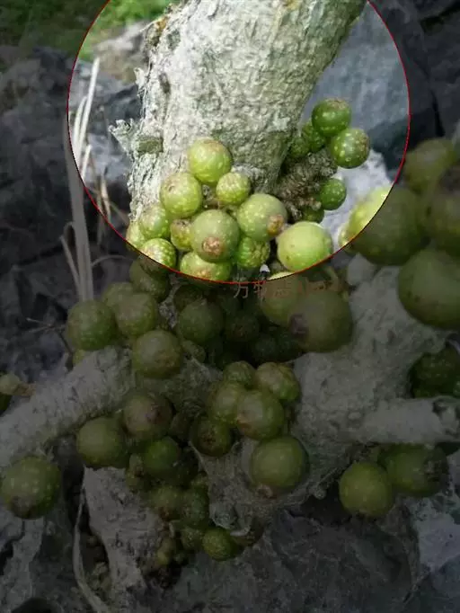 榕果簇生于老干发出的瘤状枝上,近球形,直径1.5-2厘米,光滑,成熟桔红色,不开裂,总梗长8-24毫米,雄花和瘿花生于同一榕果内壁;雄花,生于其近口部,少数,具短柄,花被片3-4,雄蕊1枚,花丝短;瘿花,具柄,花被片极短或不存,子房光滑,倒卵形,花柱近侧生,纤细,柱头膨大;雌花,生于另一植株榕果内,花被管状,围绕果柄下部。瘦果近斜方形,表面有小瘤体,花柱长,棒状。花期5-7月。