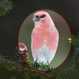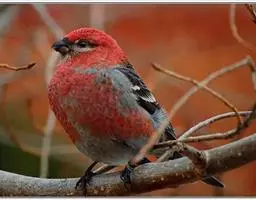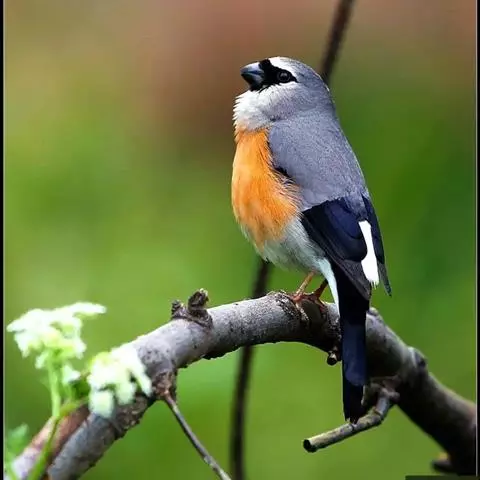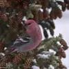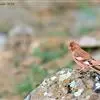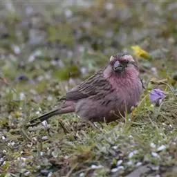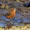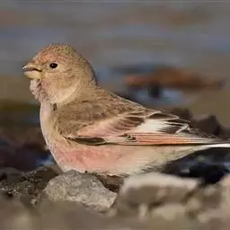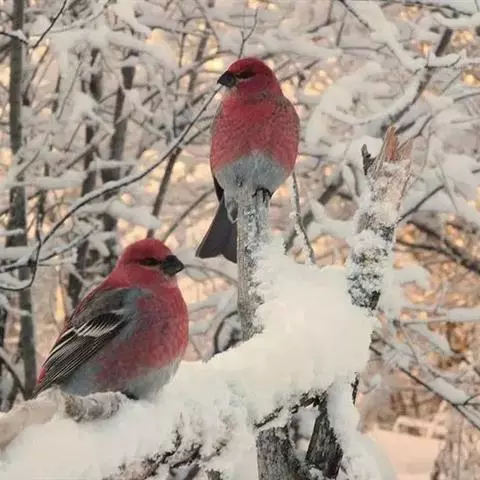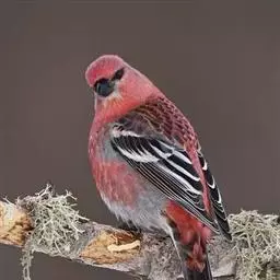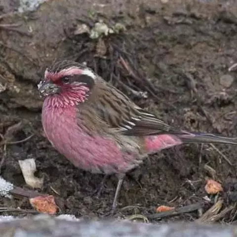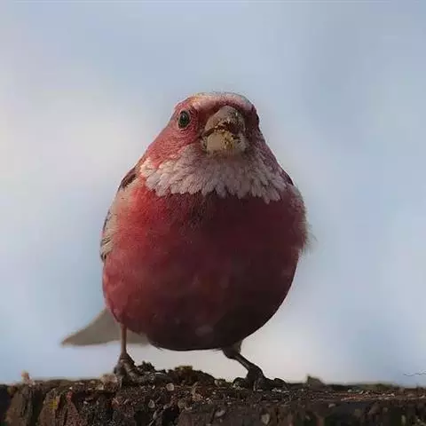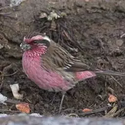 红腰朱雀:体长12-14厘米,小型鸟类。雄鸟前额和眉纹玫瑰粉红色,头顶和一宽的贯眼带深红褐色,背红…