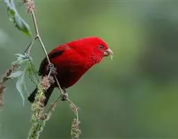 长尾朱雀:体长18厘米,体重16-26克。雄鸟额、颏和眼后为暗红色,…