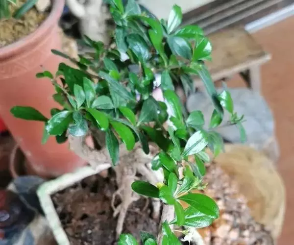 修剪造型:挑选老气横秋,虬茎飘逸,枝条密集,叶片细小,树形奇特的植株上盆莳养。秋季果实采收后,开始进行修剪造型。修剪前,要认真审察树式,保留具有观赏价值的枝条,先用棕丝细绳进行蟠扎。对于杂乱重叠枝条,要全部剪去,或者短剪,并加强肥水管理和阳光的照射,植株很快就会萌发一批健壮的新枝。这时再根据造型需要,保留适当位置的新梢,其余幼芽抹掉。这叫“蓄枝、蟠扎、曲枝、截干”的加工制作方法。操作时,剪扎并施,刚柔相济进行艺术造型。当树桩基本形态造就后,小枝嫩尖细致修剪,保持株形美态。在技巧上,蟠扎整形,枝条弯曲,变化一致,曲伸自如,线条明快流畅。用这种技法制作的盆景,株形显得挺拔、飘逸、粗犷、清秀。第二年新梢长定后,结合蟠扎,继续修剪一次,发芽后再摘一次芽。这时要特别注意树形,通过蟠扎和多次修剪,使之形成圆润的“云片”。