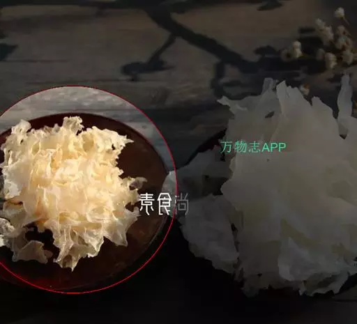 而普通的银耳就差一些了。颜色虽然也白,但是白色中略带米黄色,看上去虽然也是完整的一朵,但肉却略薄。