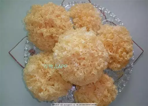 银耳为门担子菌门真菌银耳的子实体,银耳是由10余片薄而多皱褶的扁平形瓣片组成。银耳子实体纯白至乳白色,一般呈菊花状或鸡冠状,直径5~10厘米,柔软洁白,半透明,富有弹性,由数片至组成,形似菊花形、牡丹形或绣球形,直径3~15厘米。