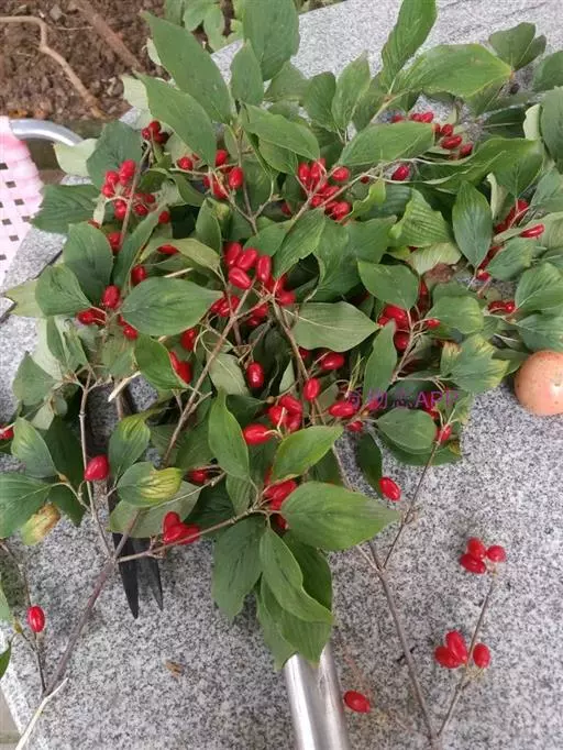 核果长椭圆形,长1.2-1.7厘米,直径5-7毫米,红色至紫红色;核骨质,狭椭圆形,长约12毫米,有几条不整齐的肋纹。花期3-4月;果期9-10月。