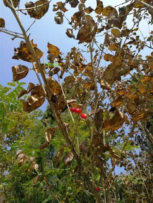 危害症状:木撩尺蠖(造桥虫)幼虫咬食叶片,仅留叶脉,造成枝条光秃,使树势生长减弱,当年结果少,第2年也不能结果。其虫卵产在山茱萸树枝分叉下部的树皮缝内。