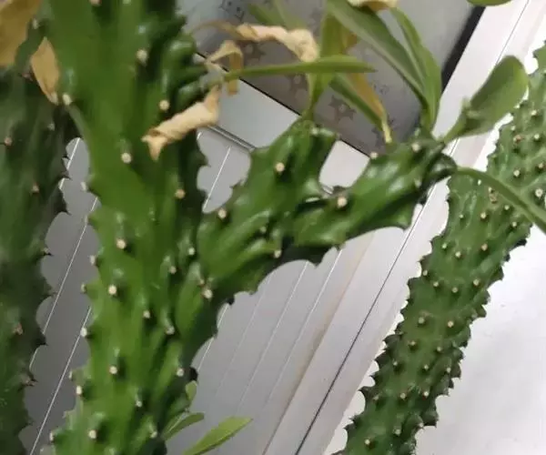 金刚纂(学名:Euphorbia neriifolia L.)是大戟科,大戟属肉质灌木状小乔木,乳汁丰富。茎圆柱状,上部多分枝,高可达8米,叶片互生,少而稀疏,肉质,生于嫩枝顶端脊上,顶端钝圆,基部渐狭,叶脉不明显;托叶刺状,宿存。花序二歧状腋生,苞叶膜质,总苞阔钟状,裂片半圆形,边缘具缘毛,雄花多枚;苞片丝状;6-9月开花。