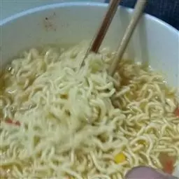 10、再次煮开后,再煮一两分钟,即捞起墨斗丸放进面中。