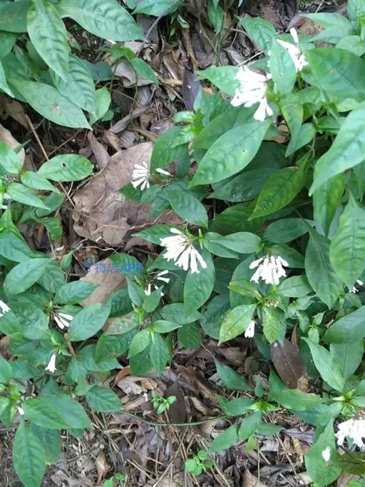 日本蛇根草,草本,高20-40厘米或过之;茎下部匐地生根,上部直立,近圆柱状,上部干时稍压扁,有二列柔毛。叶片纸质,卵形,椭圆状卵形或披针形,有时狭披针形。