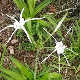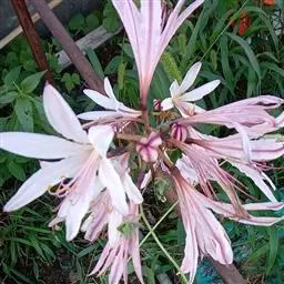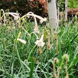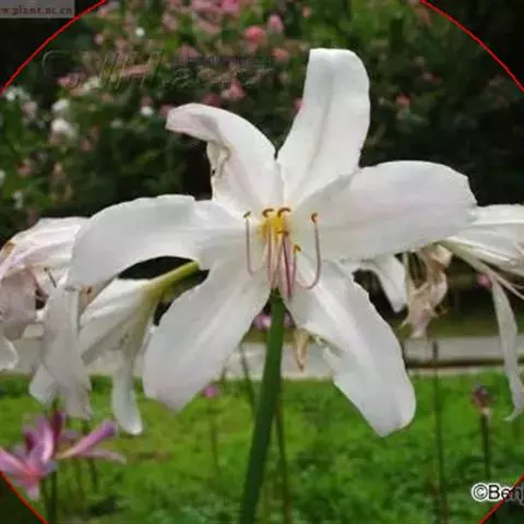 长筒石蒜草本,地生。鳞茎卵球形;叶披针形;伞形花序,有花5-7朵,花白色;花被裂片腹面稍有淡红色条纹,…