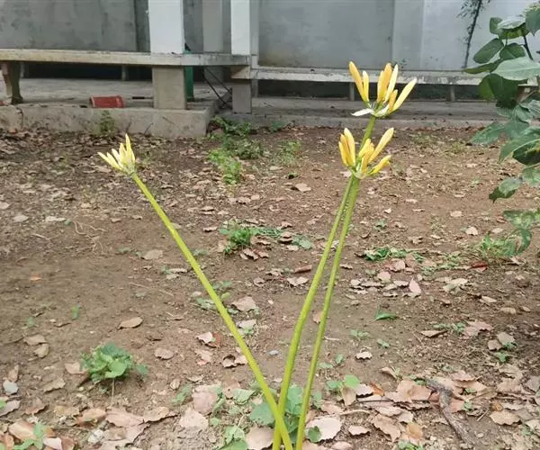 花茎高约60厘米;总苞片2枚,披针形,长约3.5 厘米,宽约0.8厘米;伞形花序有花4-8朵;花黄色;花被裂片背面具淡绿色中肋,倒披针形,长约 6厘米,宽约1厘米,强度反卷和皱缩,花被筒长1.2-1.5厘米;雄蕊略伸出于花被外,比花被长1/6左右,花丝黄色;花柱上部玫瑰红色。