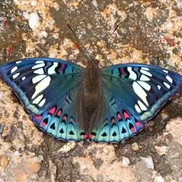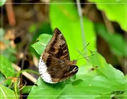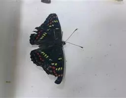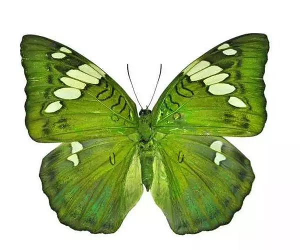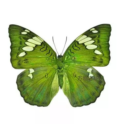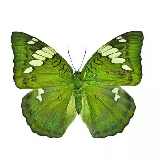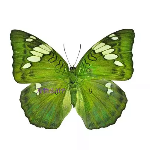 珀翠蛱蝶 两翅墨绿色,前翅中室内有深色横纹,中室外及近顶角处有数个白斑,后翅亚外缘有一列暗绿色箭形斑,外缘有白边,幼虫寄主未明。