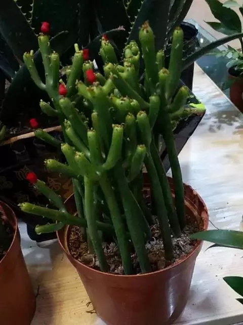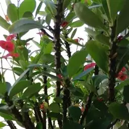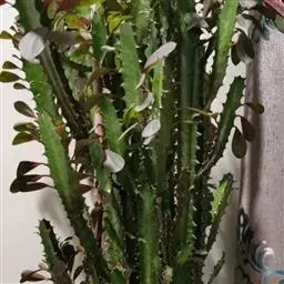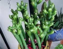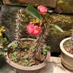 虎刺梅:别称铁海棠,是蔓生灌木植物。茎多分枝,长60-100厘米,直径5-10毫米,具纵棱,密生硬…