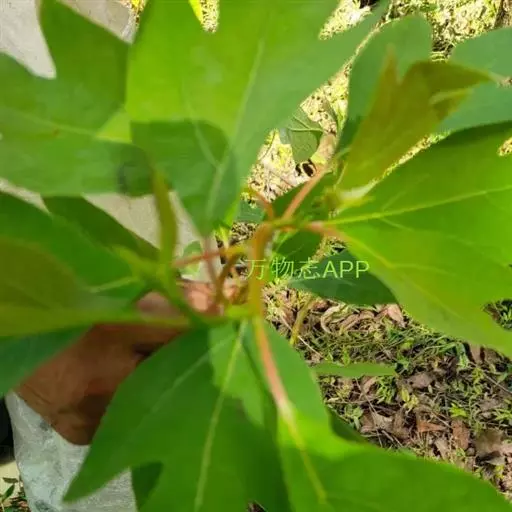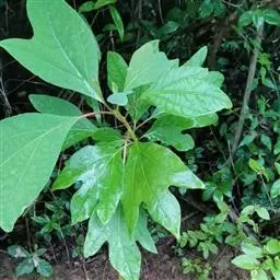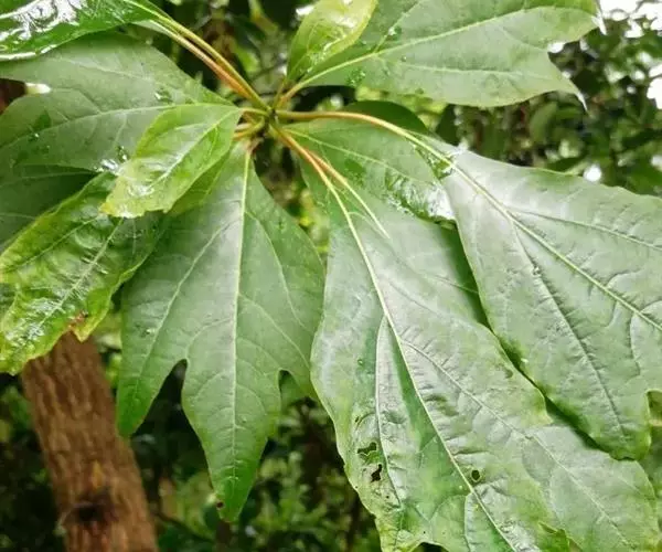 落叶乔木,高可达35米,胸径达2.5米;树皮幼时黄绿色,平滑,老时变灰褐色,呈不规则纵裂。顶芽大,椭圆形,长达1.4厘米,直径0.9厘米,芽鳞近圆形,外面密被黄色绢毛。枝条粗壮,近圆柱形,多少具梭角,无毛,初时带红色,干后变黑色。叶互生,聚集于枝顶,卵形或倒卵形,长9-18厘米,宽6-10厘米,先端渐尖,基部楔形,全缘或浅裂,裂片先端略钝,坚纸质,上面绿色,晦暗或略光亮,下面灰绿色,两面无毛或下面尤其是沿脉网疏被短硬毛,羽状脉或离基三出脉,中脉、侧脉及支脉两面稍明显,最下方一对侧脉对生,十分发达,向叶缘一方生出多数支脉,支脉向叶缘弧状网结;叶柄纤细,长(1)2-7厘米,鲜时常带红色,腹平背凸,无毛或略被短硬毛。